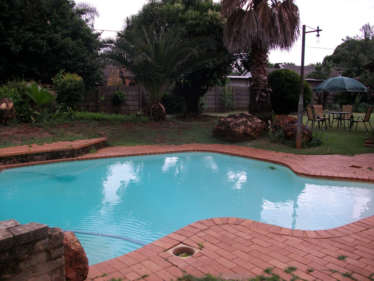 Outside Entertainment Area with a built in bar & braai (barbeque), sparkling blue swimming pool surrounded by a well manicured garden ideal for functions, events, team building or private meetings